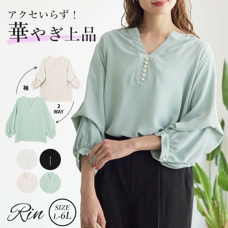 袖2wayアクセいらずで上品華やぎパール スキッパー美人ポーラブラウス