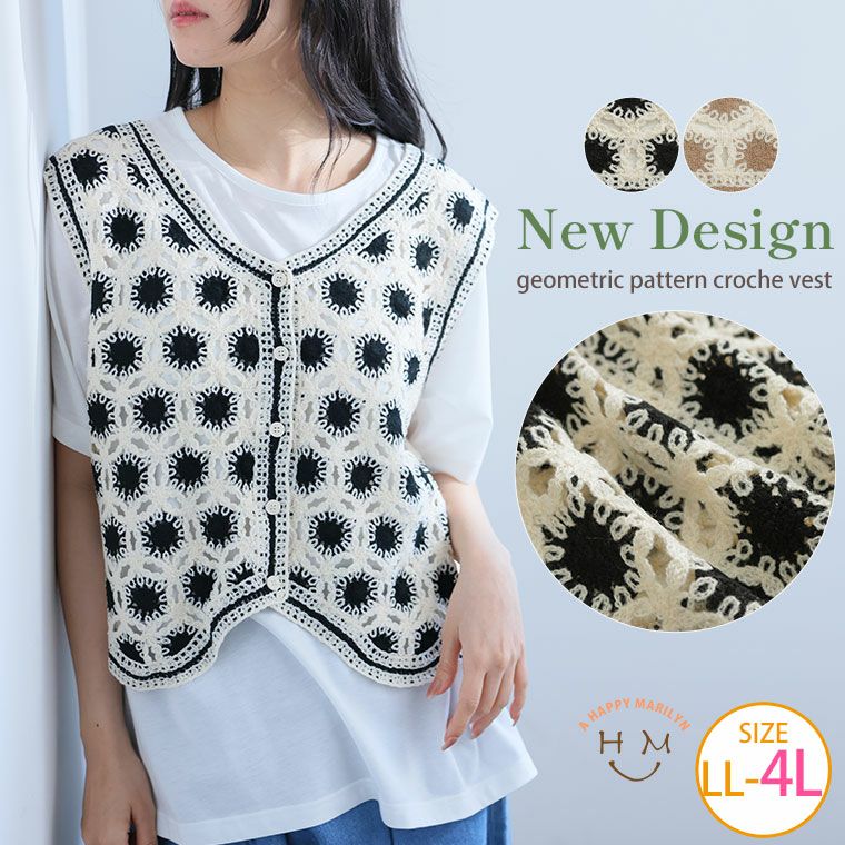 スッキリ小顔魅せVネック幾何柄かぎ編みベスト