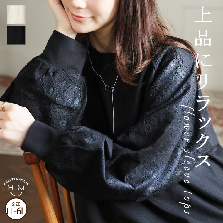 カットソー 花柄 LL 3L 4L 5L 6L 長袖 春 春物 春服 ぽっちゃり ゆったり プラスサイズ カジュアル かわいい おしゃれ ナチュラル 【新作◆1月27日販売】 レース切り替え ドルマン プルオーバー 二の腕カバー | 大きいサイズの通販ならハッピーマリリン