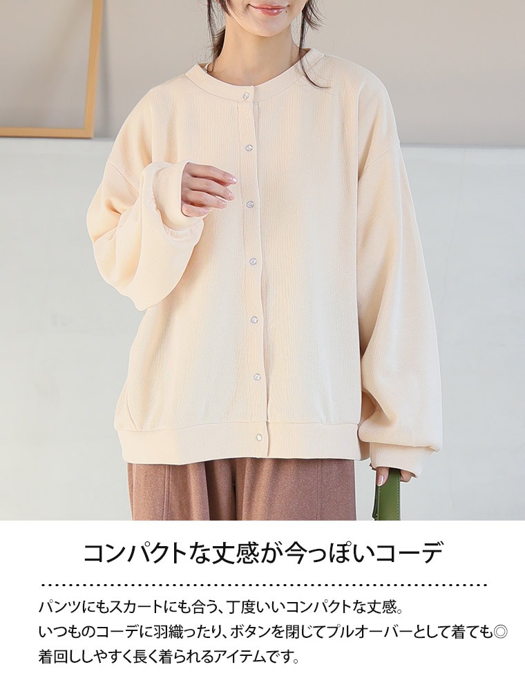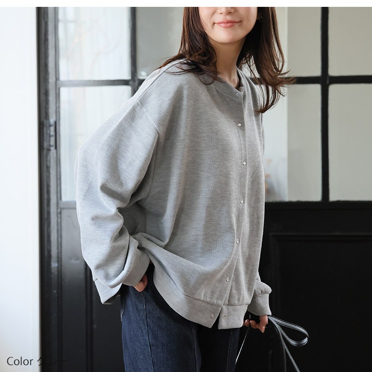 スウェットのような感じの生地ですが、厚すぎずちょうど良いです。 前がスナップボタンだから着脱しやすいのも◎ 袖がややゆるっとした感じですが、可愛いと思います。