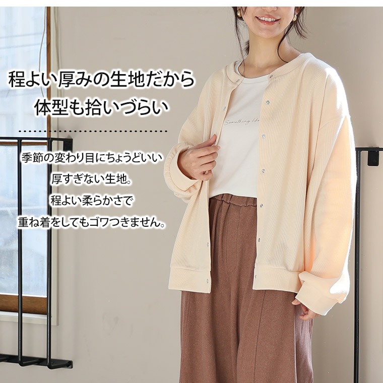 ニットと言うよりスエットみたいな感じで生地はしっかりしています。今から春に向けて 前を全部止めたり、 羽織ったり色々使えそうです。アイボリーを購入しましたが、色は写真と変わりませんでした