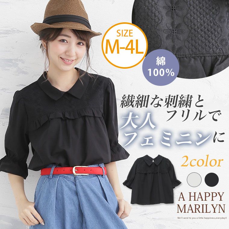 他の画像を見る トップス ブラウス M L LL 3L 4L 夏 夏物 夏服 夏用 ぽっちゃり ゆったり おしゃれ オシャレ かわいい ナチュラル カジュアル 体型カバー 袖コンシャス ふんわり 肌触り 五分袖 刺繍 キャンディスリーブ ブラウス | 大きいサイズの通販ならハッピーマリリン 価格 ¥ 3,289 税込 3.00 在庫切れ お気に入りに登録する