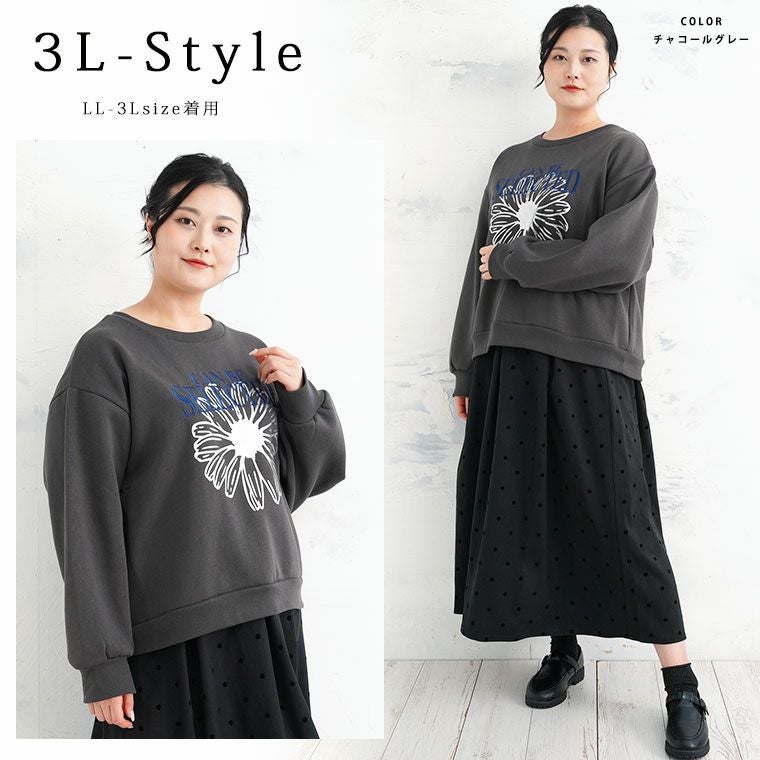 他の画像を見る トレーナー LL 3L 4L 長袖 冬 冬物 冬服 裏起毛 プルオーバー ドロップショルダー トレンド ぽっちゃり ゆったり 春 着るだけ「華やか」フラワー箔プリント ロゴ刺繍 裏起毛 スウェット | 大きいサイズの通販ならハッピーマリリン 価格 ¥ 3,190 税込 5.00 お気に入りに登録する