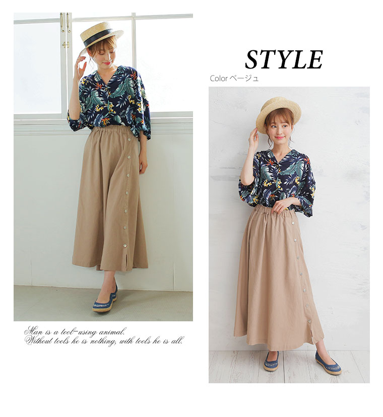 サイドの飾り釦がおしゃれ。ゆったりシルエットで下半身をカバーできます。