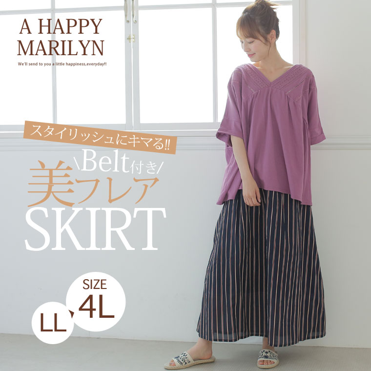 ボトムス ロングスカート マキシスカート ロング丈スカート LL 3L 4L 夏 夏物 夏服 夏用 ぽっちゃり ゆったり かわいい おしゃれ カジュアル ナチュラル チェック ストライプ 選べる ベルト付き スカート