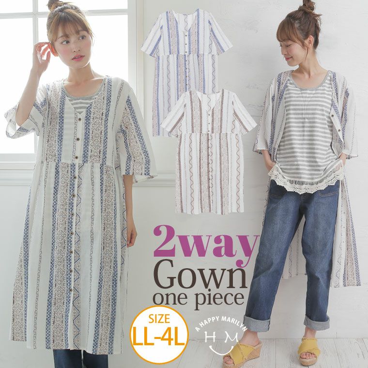 2wayで使える爽やかなストライプエスニック柄が大人可愛い!!ガウンワンピース