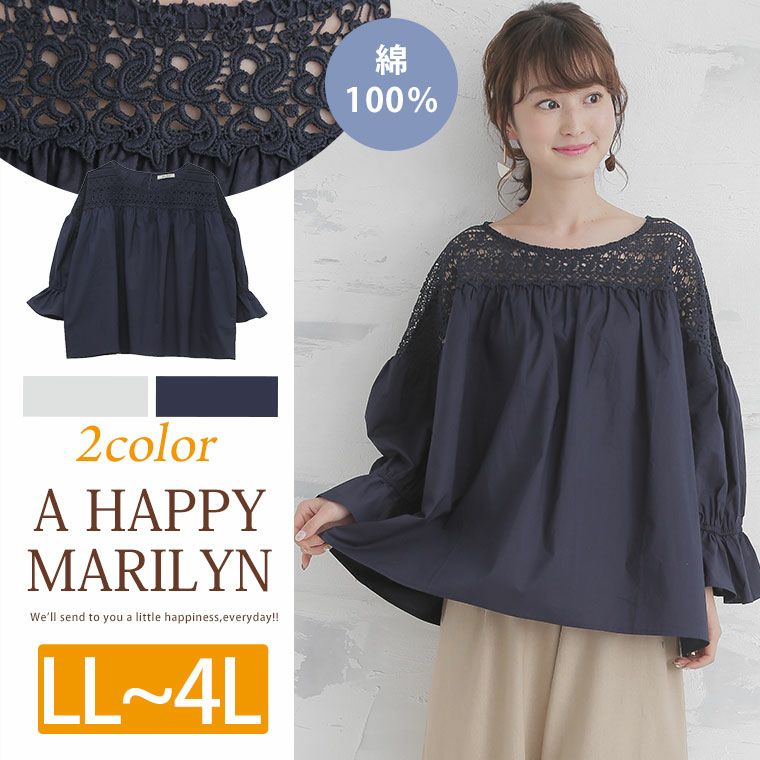 胸下ギャザーとキャンディスリーブでふんわりとしたシルエット。レース切替長袖ブラウス