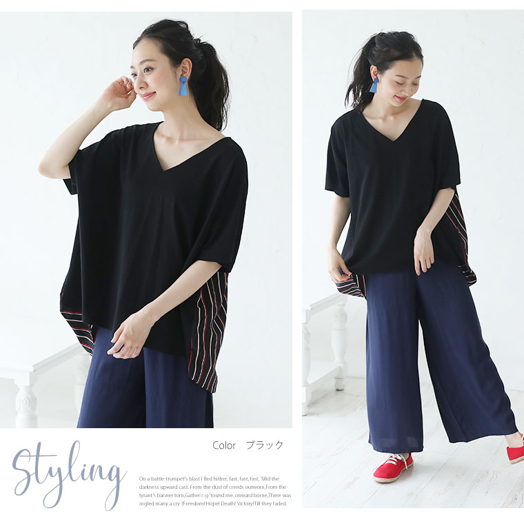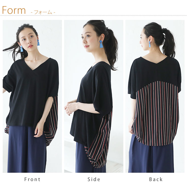 4. 大きいサイズ ストライプ 切替 Vネック プルオーバー