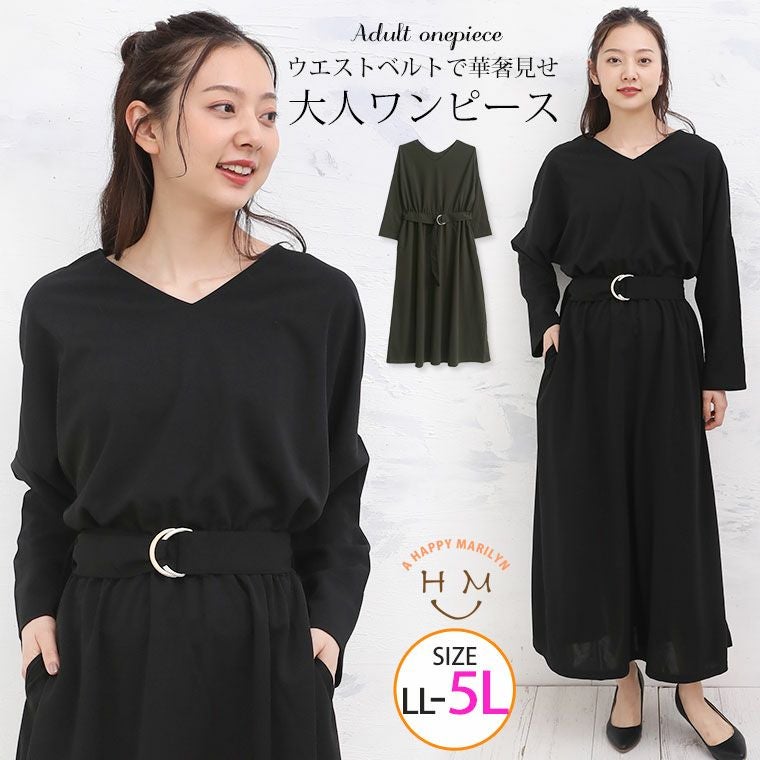 ウエストのベルトできゅっと締めるロング丈ワンピース