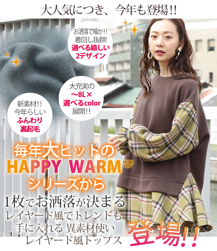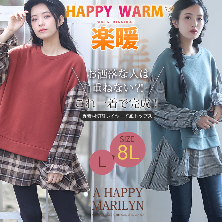オリジナル LL 3L 4L 5L 6L 7L 8L 冬 冬物 冬服 ぽっちゃり ゆったり お腹 胸周り 二の腕カバー 長袖 HAPPYWARM お肌に優しい嬉しい7つの機能 発熱 保温 保湿 吸水速乾!! HEAT 裏起毛 異素材切替 レイヤード風 トップス