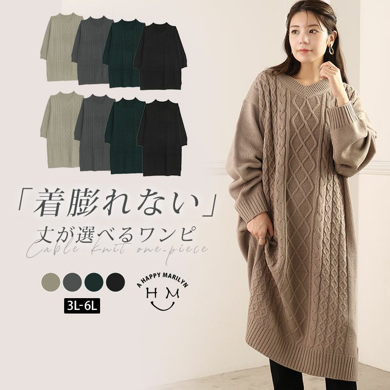 4. 大きいサイズ Iライン でスッキリ着痩せ 丈が選べる ケーブル編み ニットワンピ | 大きいサイズの通販ならハッピーマリリン