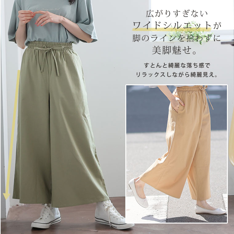 40代、156cm。 3L-4L スミクロ を購入。 どちらかというとパリッとした綿って感じで、のびーるという感じはないです。 その分歩くときにまとわりついて来ないので、空気の通りがいい。 ウエストのリボンが長いので、トップスに合わせて結べる部分を調整して見せられるのがポイント。 汗じみが気になる人は濃い色のものを選んだり、夏用の下半身インナーを買うのがおすすめです。