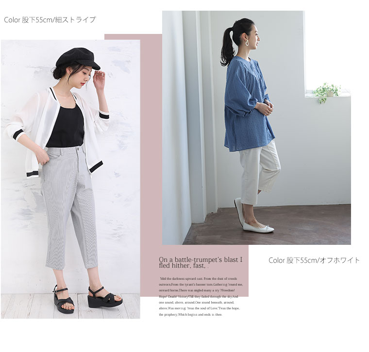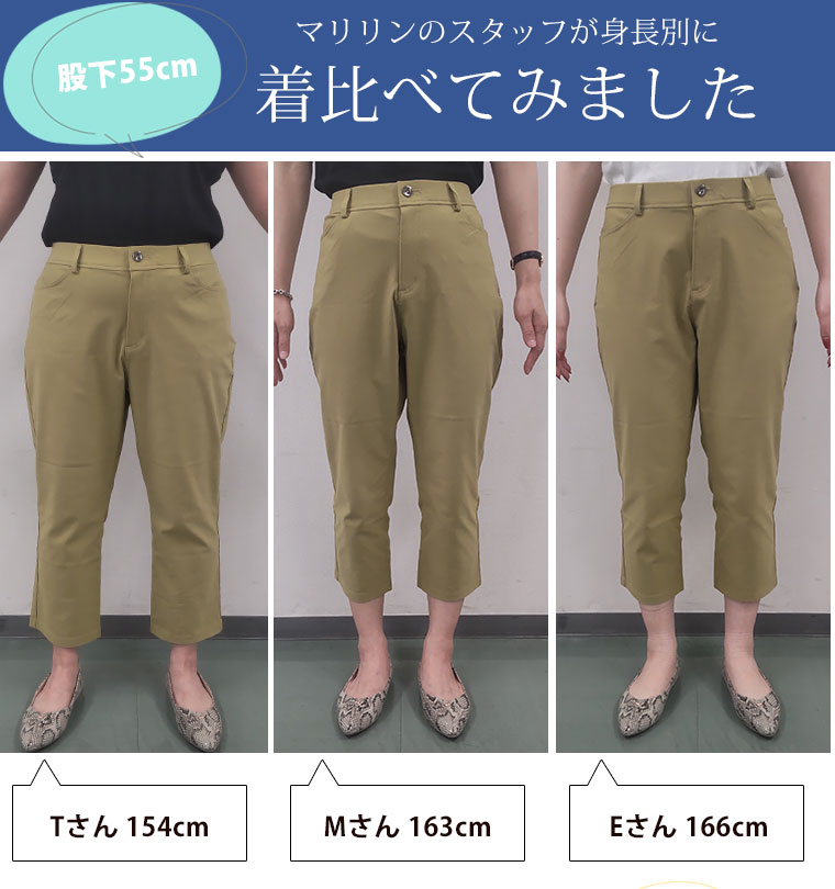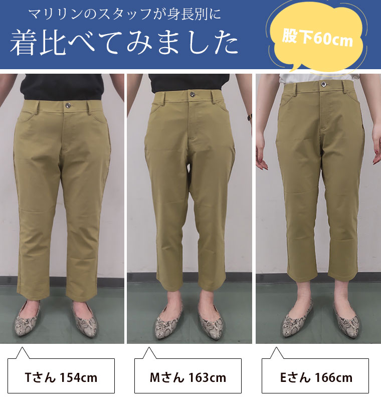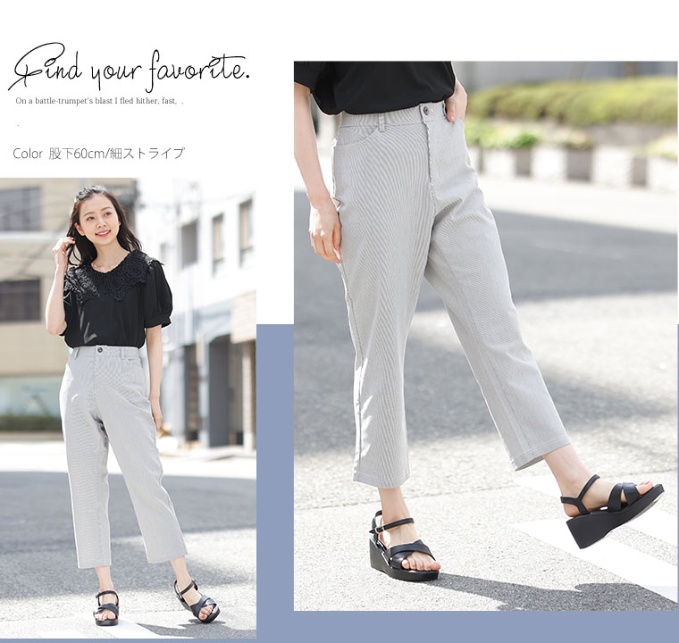 暗い色味のボトムスばかり好んで履いていたのですが、今回初めて細ストライプを購入しました。錯覚効果かな?白っぽいのに膨張して見えないし、何色のトップスにも合うし、爽やかなイメージでとても気に入りました。 履き心地もサラッとしていて汗をかいても張り付かず、よく伸びる生地なので動きやすかった。 身長168㎝なので股下が短いかもと心配でしたが、太いふくらはぎも丁度よく隠れて足首が細く見えました。 この夏だいぶ履き倒したけど膝もお尻も型崩れしなかったので、来年の夏も履くと思うw 色ちがいも欲しいです。
