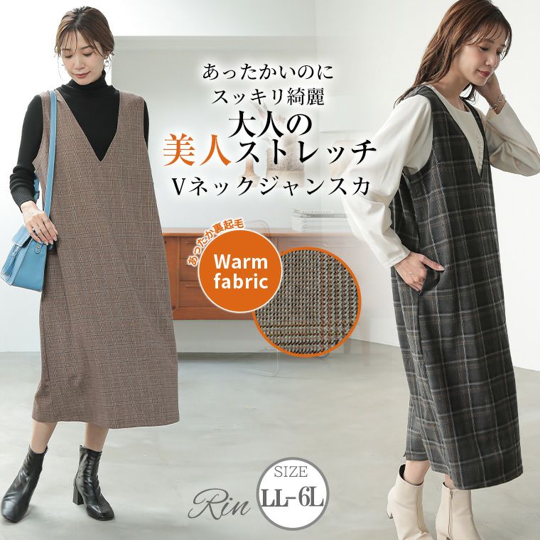 ジャンパースカート LL 3L 4L 5L 6L 秋 Rinあったかいのにスッキリ綺麗 TR両面起毛 ストレッチ 美人 Vネック ジャンスカ チェック 無地 楽ちん 着やせ オフィス 大人 ビジネス 通勤 ママ | 大きいサイズの通販ならハッピーマリリン