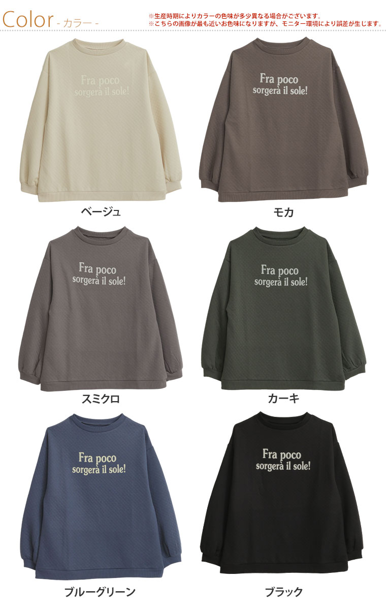 ■着用感:ちょうどいい、■着丈:ヒップ半分、■バスト:ちょうどいい、■腕回り:ややゆったり、■袖口:ちょうどいい、■袖丈:長袖、■首回り:ちょうどいい、■ウエスト:-、■ヒップ:-、■太もも:- ●生地の表面感が可愛いです。ゆったり着られて着心地が軽く、可愛いのにストレスフリーです♪