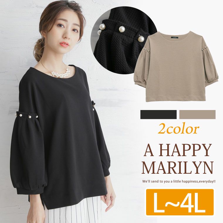 適度な厚みのリップル生地で大人っぽく。パール付きタックボリューム袖トップス