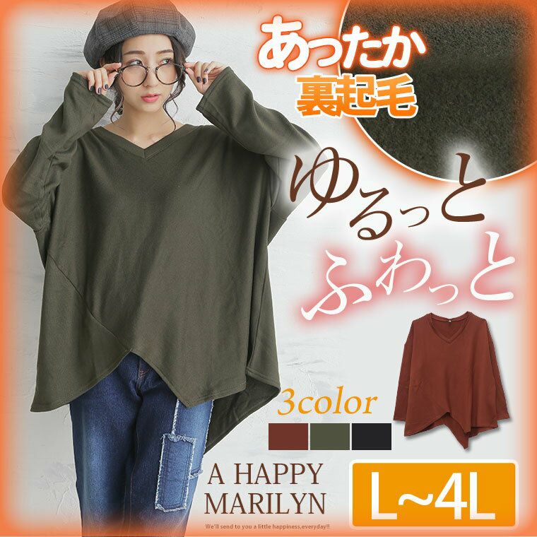 裾がアシンメトリーデザインでさりげなく体型カバー効果のある裏起毛長袖プルオーバー