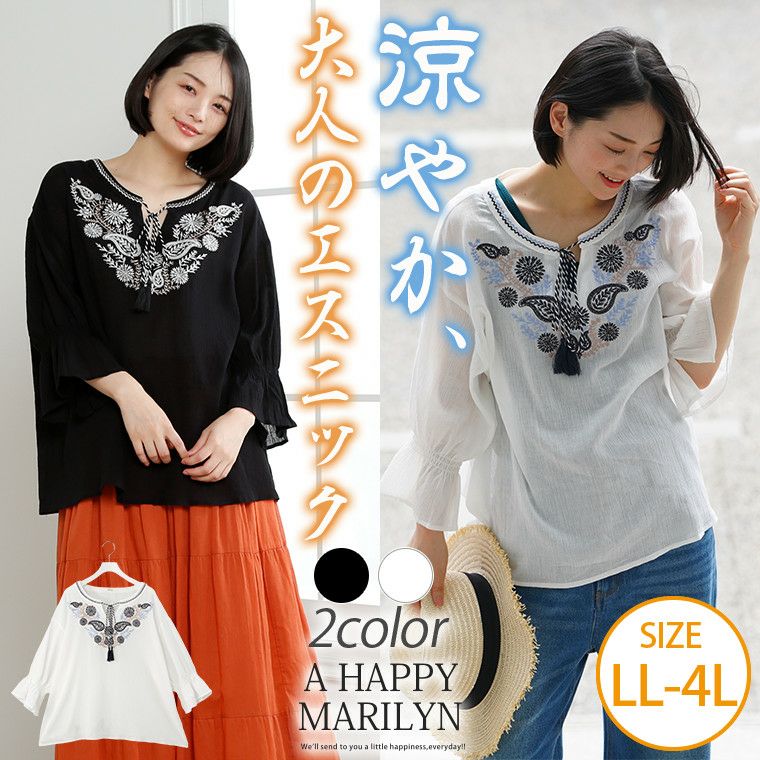 ナチュラルな風合いと胸元のエスニック調刺繍&紐が可愛いブラウスです