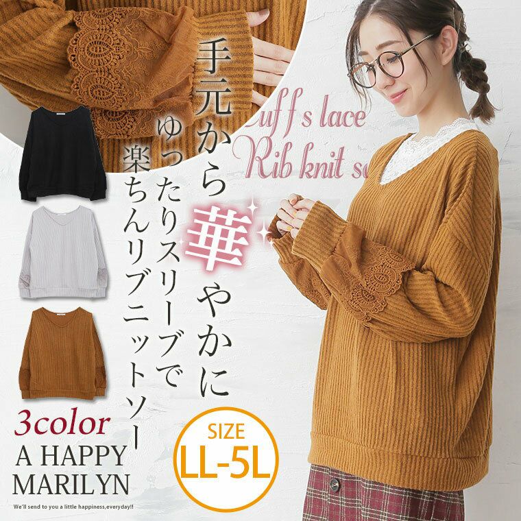 袖口に立体的なレースをあしらって華やかに。起毛リブ長袖ニットソープルオーバー