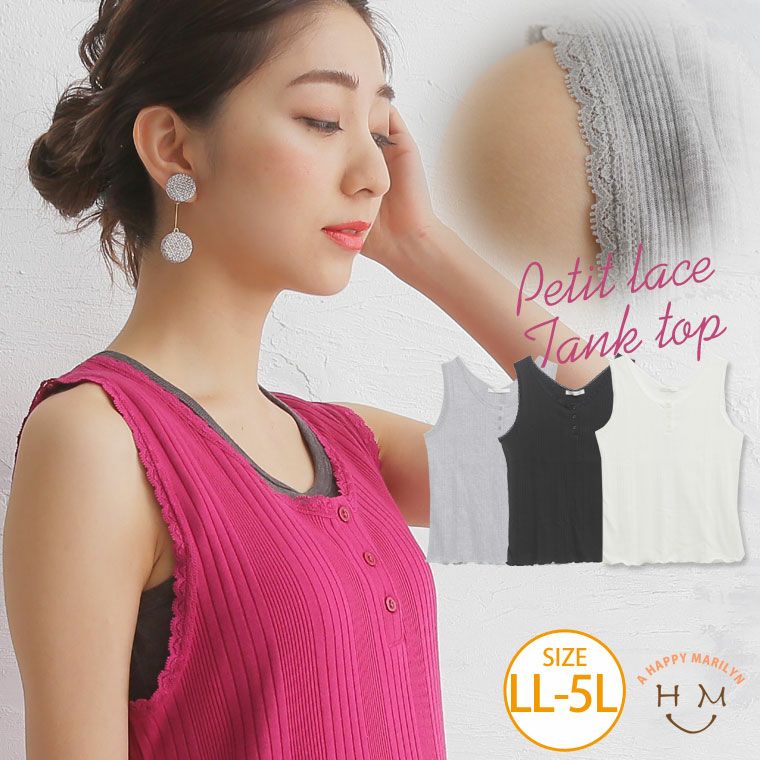 5. 大きいサイズ ランダムテレコ ヘンリーネック プチレース タンクトップ【メール便可1】 | 大きいサイズの通販ならハッピーマリリン