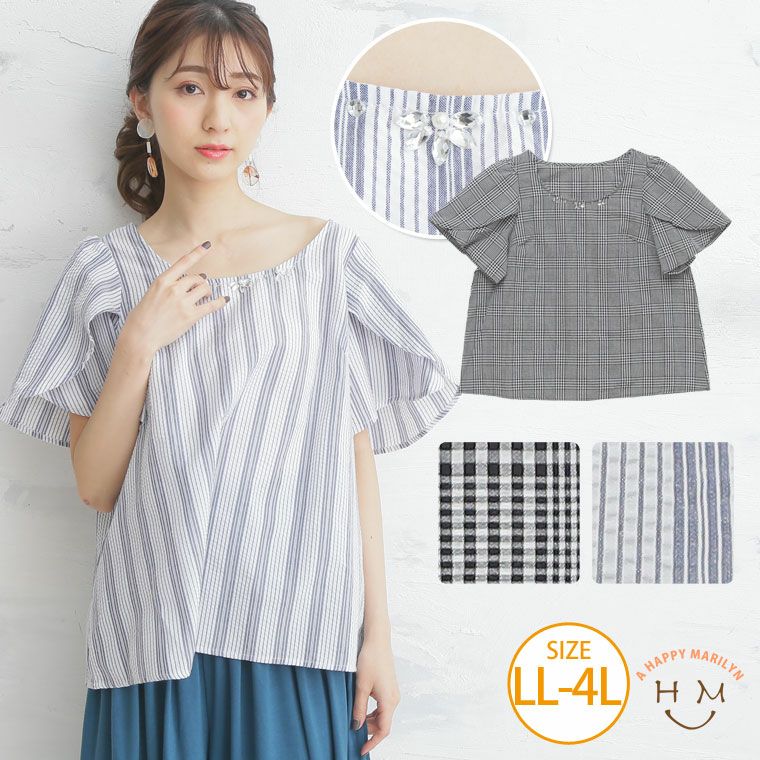 ネックラインを飾るビジューがアクセント。フリル袖ブラウス