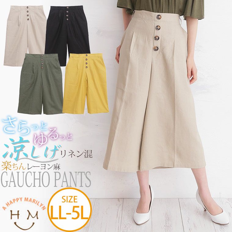 レーヨン麻で涼し気な素材。タック膝下ガウチョパンツ