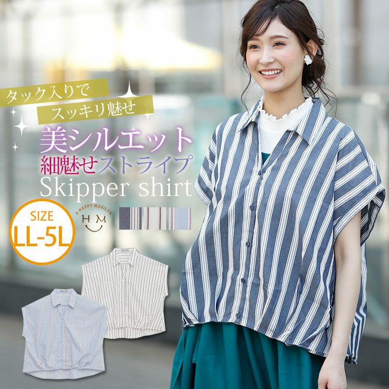 すっきり着痩せ効果のあるストライプ前開きフロントタックスキッパーシャツ