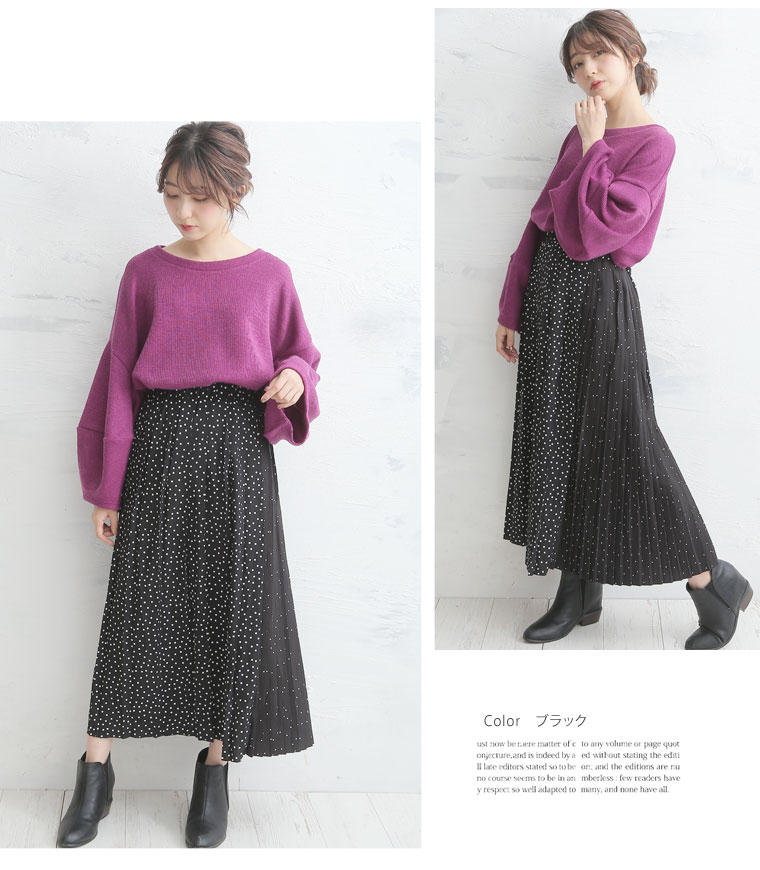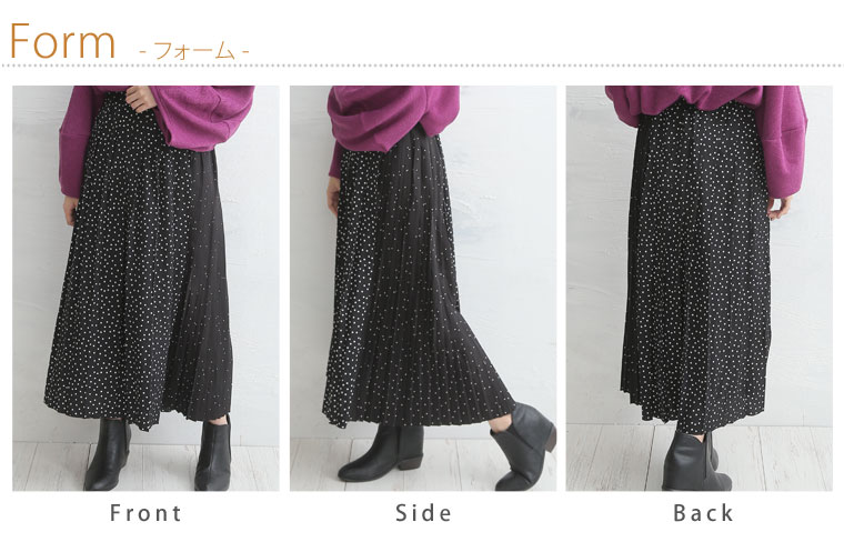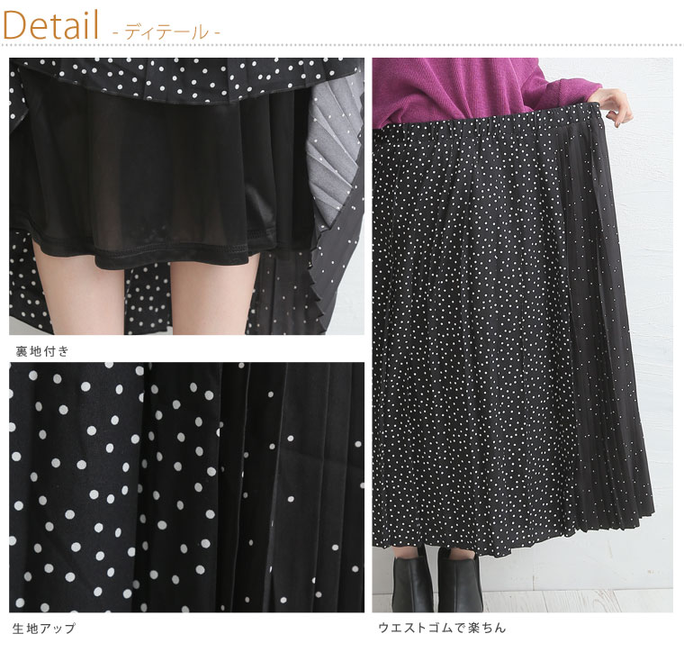 レトロなデシンドット柄で華やかな着こなしに。プリーツロングスカート
