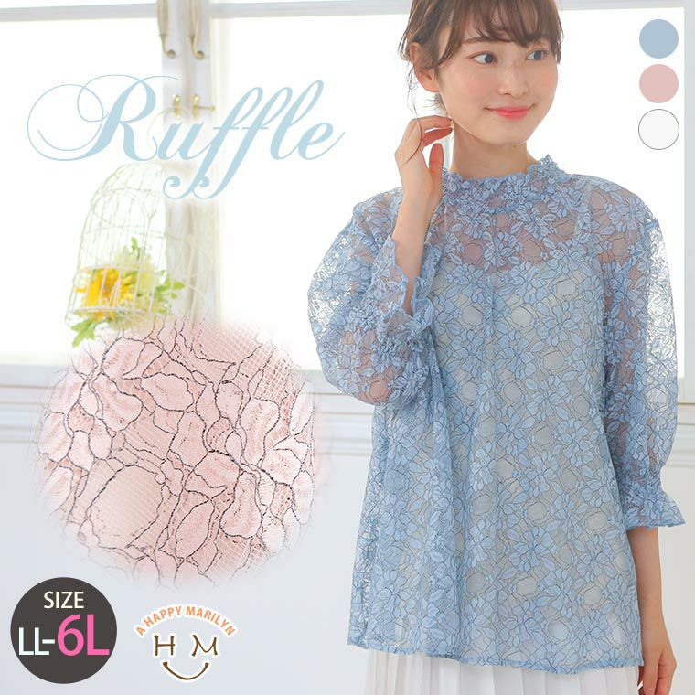 トップス レース LL 3L 4L 5L 6L 夏 夏物 夏服 夏用 ぽっちゃり ゆったり 花柄レース 襟シャーリング 五分袖 プチハイ プルオーバー シアー | 大きいサイズの通販ならハッピーマリリン