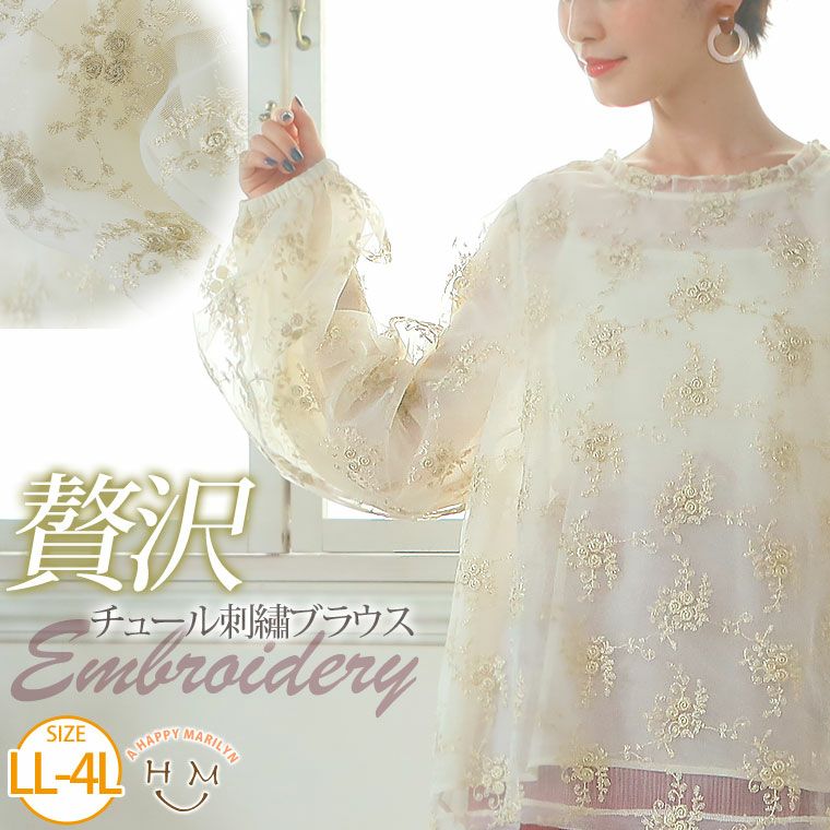 華やか上品 チュール刺繍マオカラーボリューム袖ブラウス