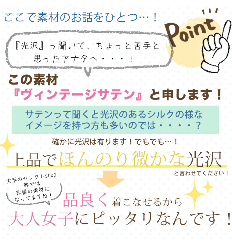 デザインは期待通りでした。 が、商品の状態が酷かったです。 型紙?敷紙?を服で包む恰好でビニール袋に入っていたのですが、一度他で返品された物だったのか どうみても敷き紙が使い古しで、下半分がぐしゃぐしゃに掴んだ様な跡だらけで端もボロボロにほつれていわばゴミ 運送の途中で揉まれた程度ではああはならないだろうと思える状態でした。 服の方はシワなどにはなってなかったし。 そして再梱包の際?に混入したものなのか明らかに服の生地とは異なる 1㍉以下程度の白い小さな粒の様なモノが所々に混ざっていました。 無いとは思いますが、万が一トコジラミの卵だったりしたら部屋が取り返しのつかない事になるので 一旦ビニールに戻して数日様子を見てます。まだ袖を通せてません。 念のため熱湯消毒しようかとも思いましたが着る前から服が痛みそうなのでまだ保留中。 ただのホコリカスでありますように… 何度かこちらで購入して、その辺りは問題なく安心できるイメージを持っていただけに今回少しショックでした