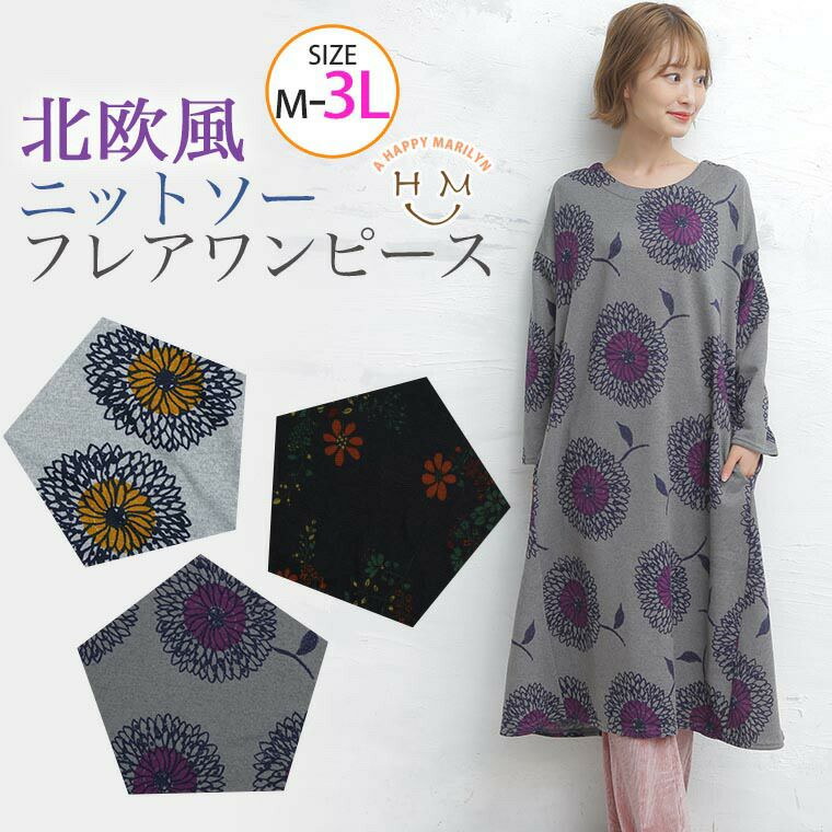 選べる北欧風花柄ニットソーフレアワンピース