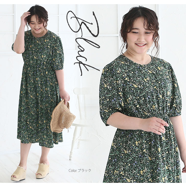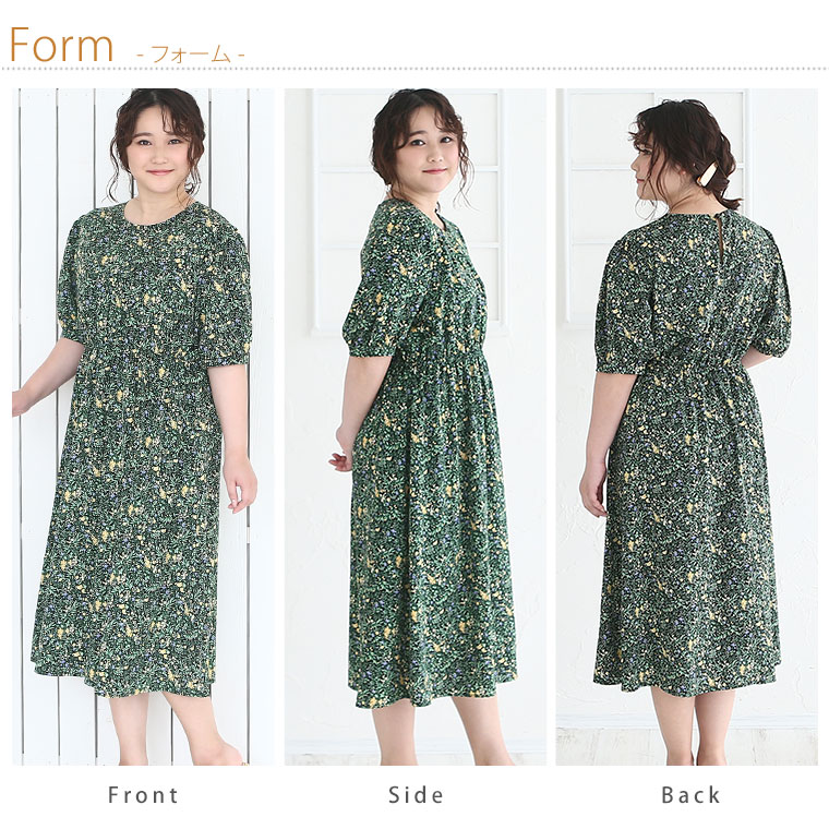 3. 大きいサイズ ジョーゼット ボタニカル柄 プリント バックオープンワンピース