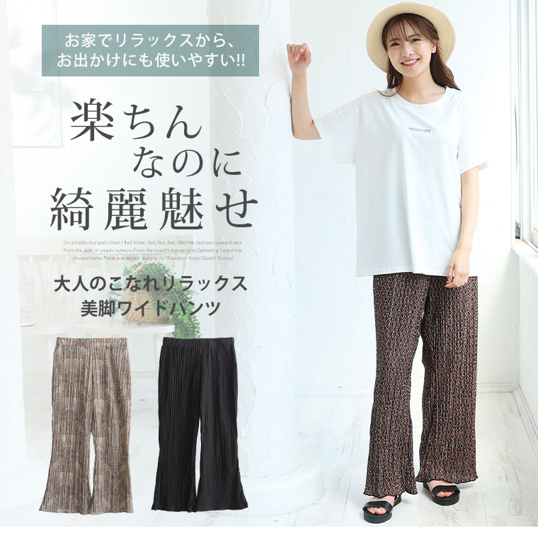 大きいサイズ 柄 と 無地 で選べる 楽ちん カットソー プリーツ フレアーパンツ