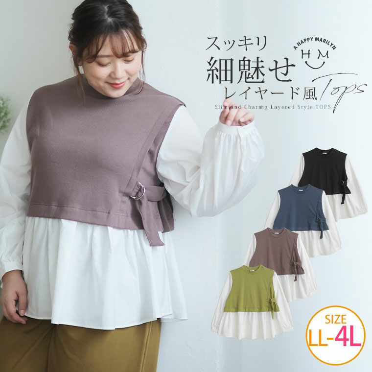 カットソー LL 3L 4L 秋 秋物 秋冬 ぽっちゃり ゆったり フェイクレイヤード レイヤード風 重ね着風 かわいい おしゃれ カジュアル プラスサイズ テレコリブ ドッキング プルオーバー | 大きいサイズの通販ならハッピーマリリン