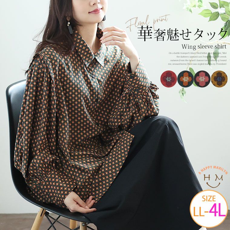 くすみカラーの花柄でレトロに魅せるギャザー袖ブラウス