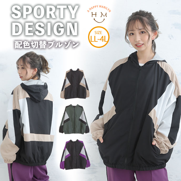 4. 大きいサイズ フード付き 配色 切替ブルゾン