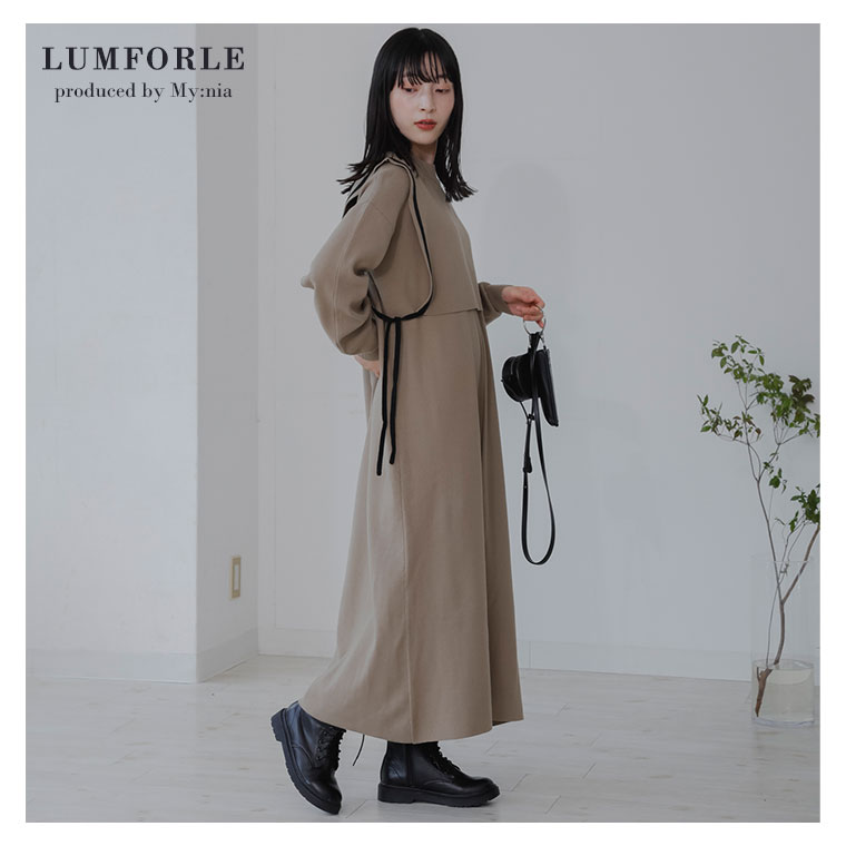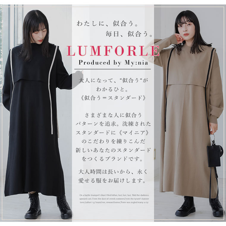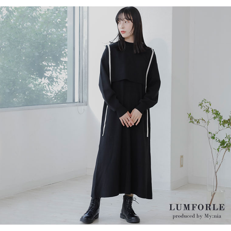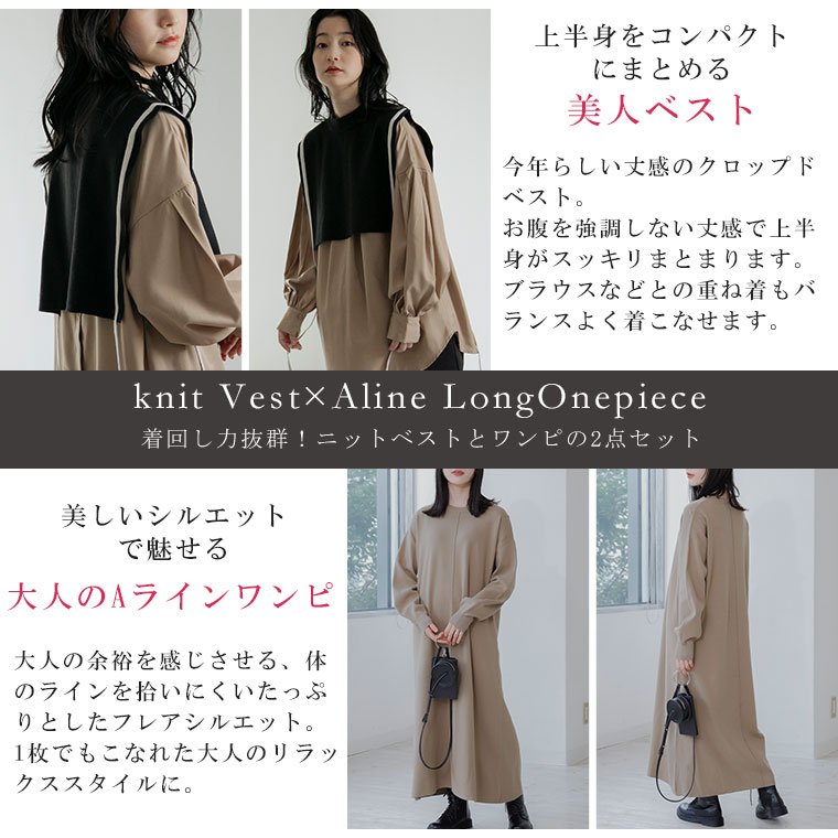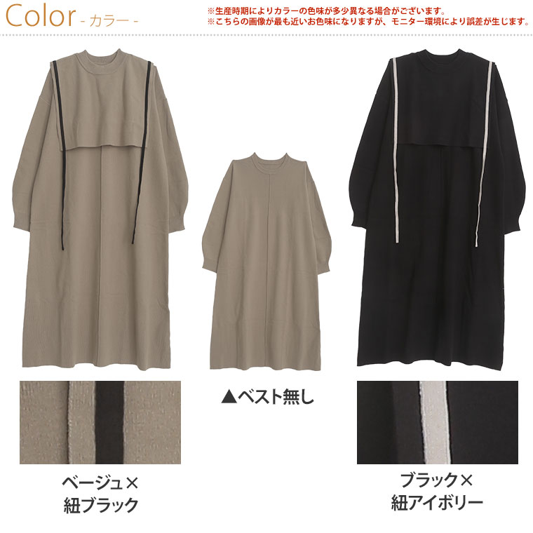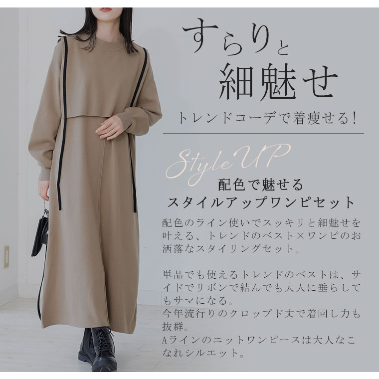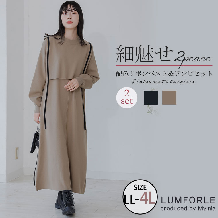 上下セット set LL 3L 4L 秋 秋物 秋服 冬 冬物 冬服 ぽっちゃり ゆったり カジュアル ナチュラル プラスサイズ きれいめ 上品 【LUMFORLE produced by My:nia】総針配色 リボンベスト+ワンピ