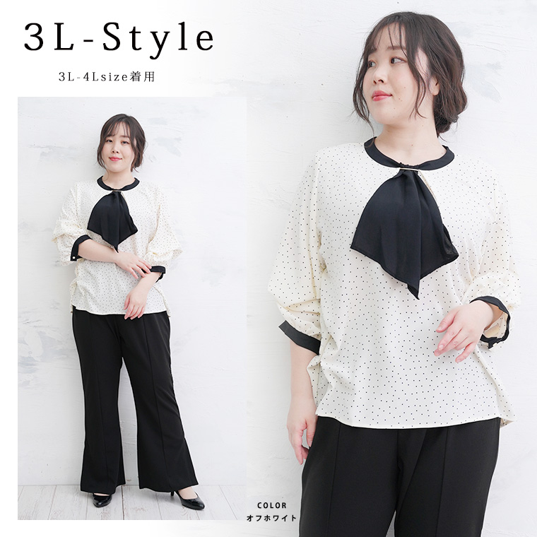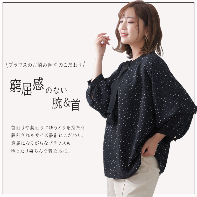 シャツ トップス LL 3L 4L 5L 6L 冬 冬物 冬服 ぽっちゃり ゆったり リン きれいめ 上品 華やか 高見え エレガント プラスサイズ キレカジ Rin オフィスでも活躍! 大人の 袖2way ドット柄 ボウタイブラウス 【セレモニー】