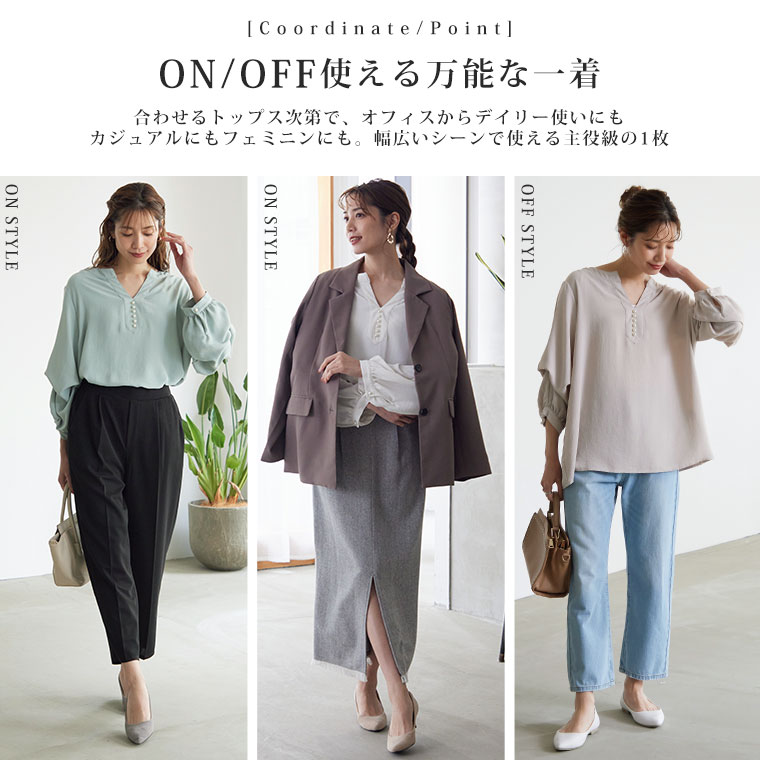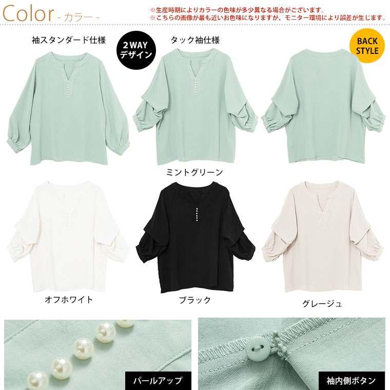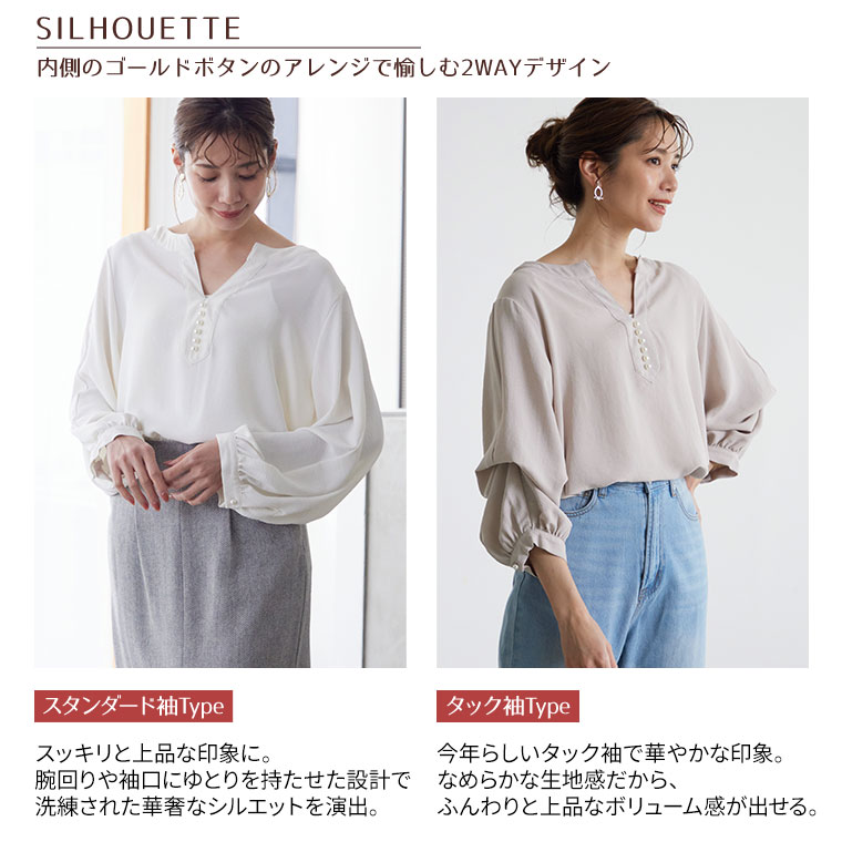 袖2wayアクセいらずで上品華やぎパール スキッパー美人ポーラブラウス