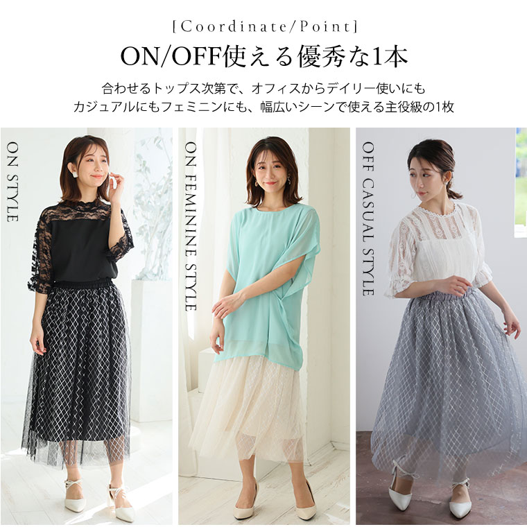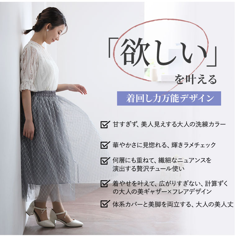 ふわりと軽やかでシンプルなトップスに合わせるだけで