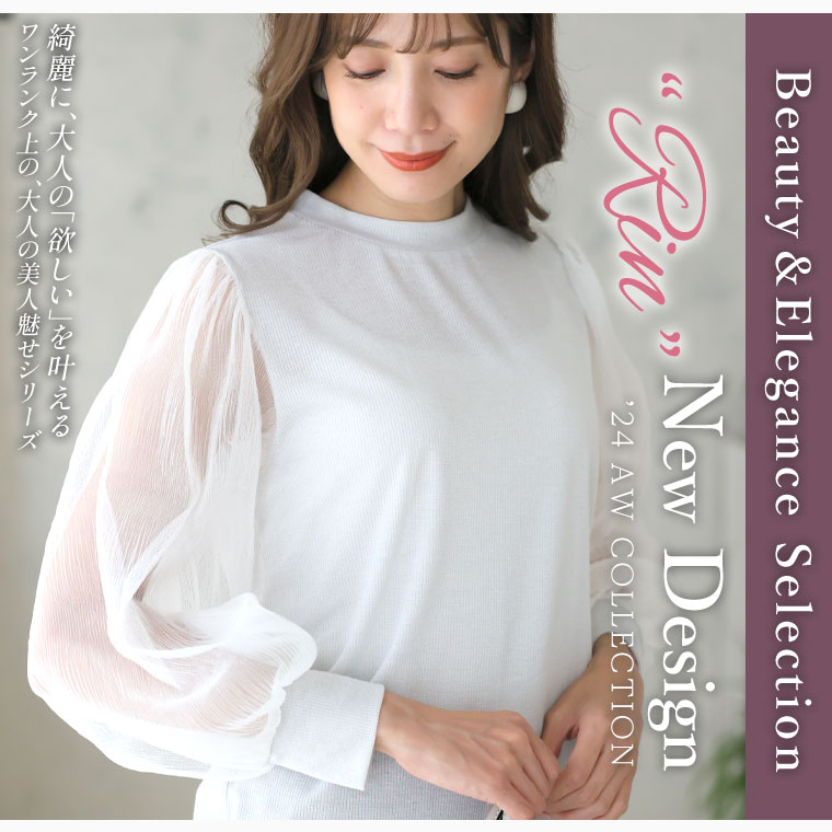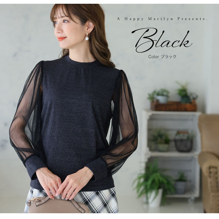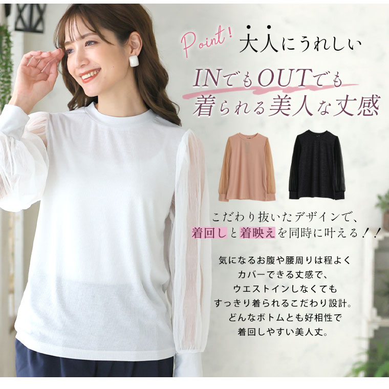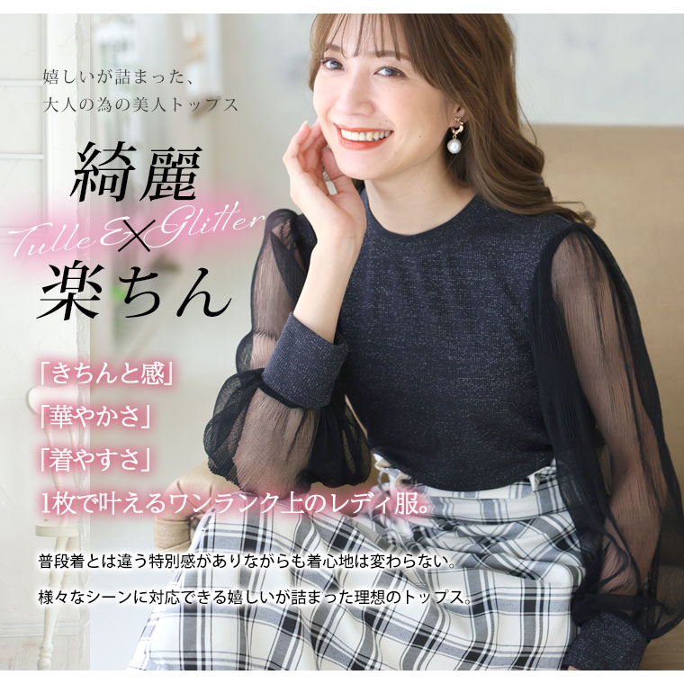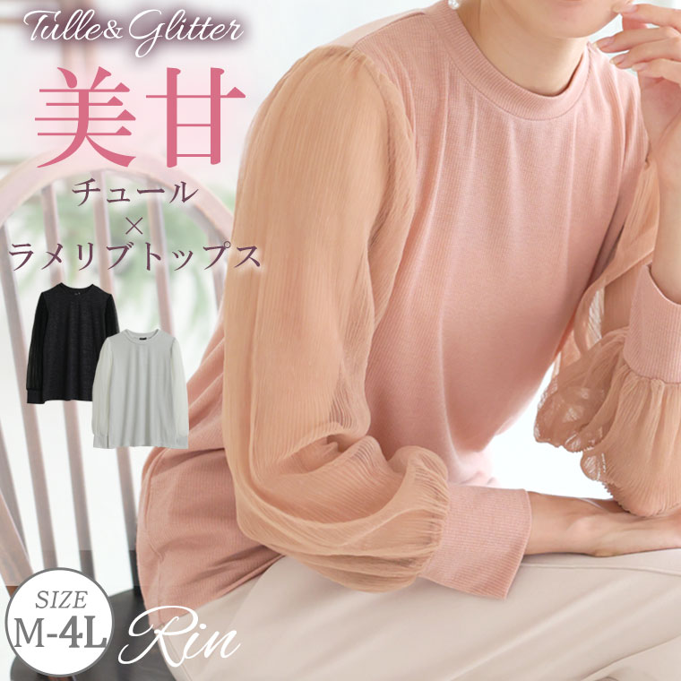 トップス LL 3L 4L オフィス 大人 着やせ 体型カバー ビジネス 通勤 ママ 秋 秋物 秋服 冬 冬物 冬服 ぽっちゃり ゆったり プラスサイズ かわいい Rin 大人の上品華やぎ ラメリブ袖 チュール切替トップス