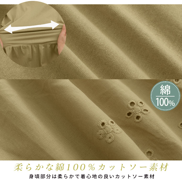 ■着用感:ちょうどいい、■着丈:ヒップ半分、■バスト:ちょうどいい、■腕回り:ちょうどいい、■袖口:ちょうどいい、■袖丈:7分、首回りちょうどいい、■ウエスト:-、■ヒップ:-、■太もも:- ●丁度いいサイズ感です。七分袖で二の腕も隠れて嬉しい!刺繍レースがアクセントになって可愛いです。