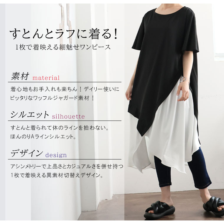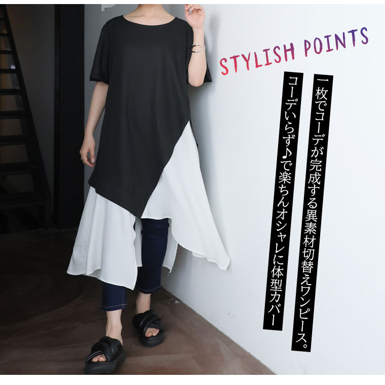 トップス LL 3L 4L 半袖 夏 夏物 夏服 夏用 ぽっちゃり ゆったり プラスサイズ かわいい おしゃれ カジュアル ナチュラル ランダム切替え スラリ魅せ ロング丈 チュニック