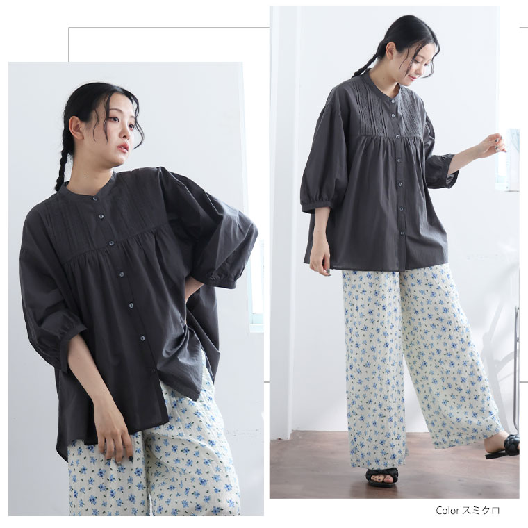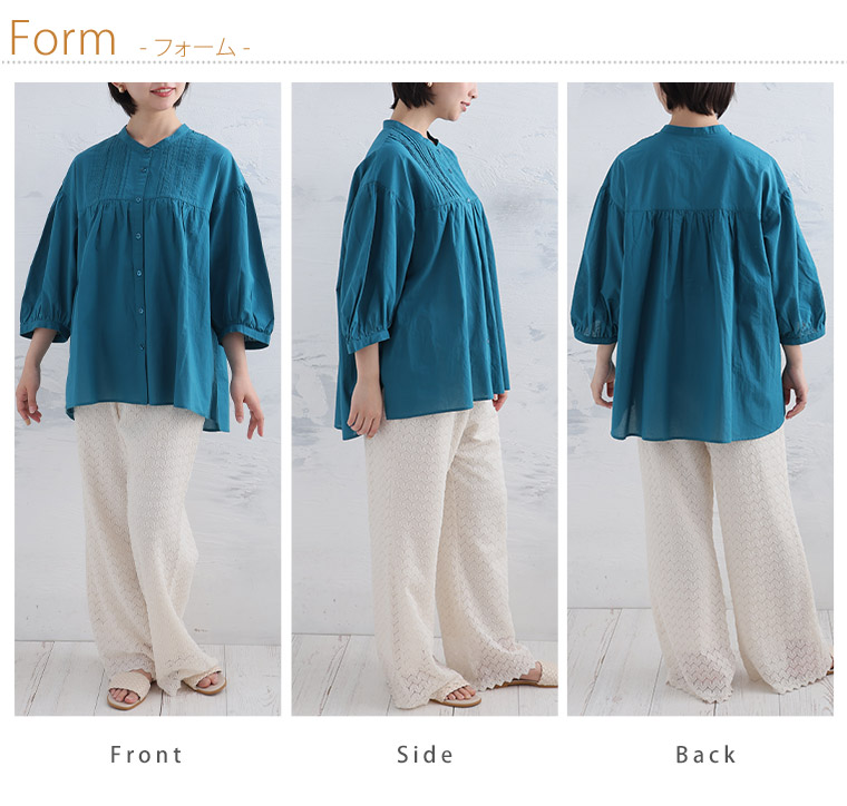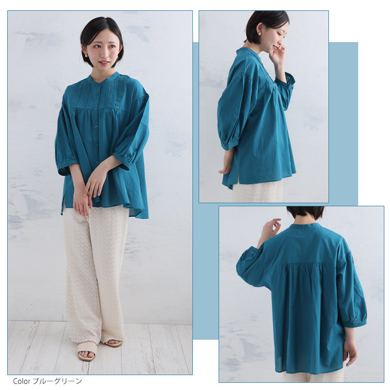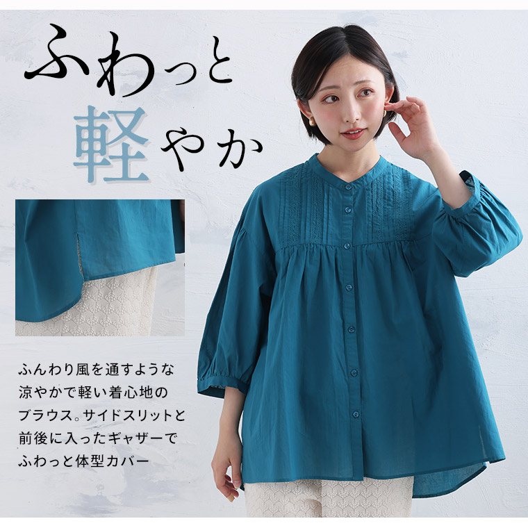 たっぷりギャザーで腰周りもふんわりカバー風を感じる爽やかな着心地のブラウスです