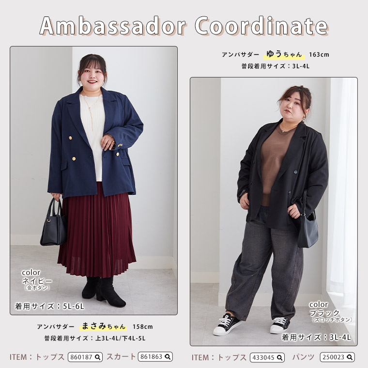 普段は4Lを中心に着用。こちらのジャケットは3L-4Lにするとスーツのジャケット感があり、4L-5Lにするとコートっぽいジャケットになります。ぱっと見大きいかな?と思いますが、秋冬はインナーも分厚くなるので4L-5Lにしました。金ボタンは高級感がないのでつけかえようかな?と思っています。室内で着ていても、外で着ていても違和感のない絶妙なデザインです。黒ボタンの3L-4L買い足そうかなと思ったら売り切れか・・。袖をおりかえせるように袖部分だけ裏地がありますが、袖を通す時の滑りやすさがあるので裏地つき、とてもいいです。体部分には裏地がありません。