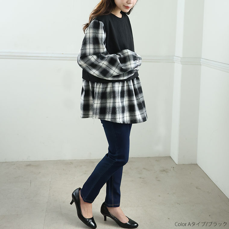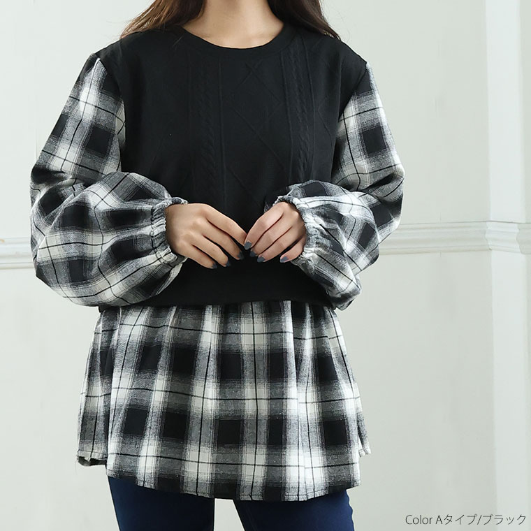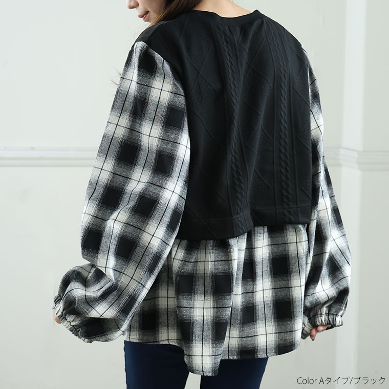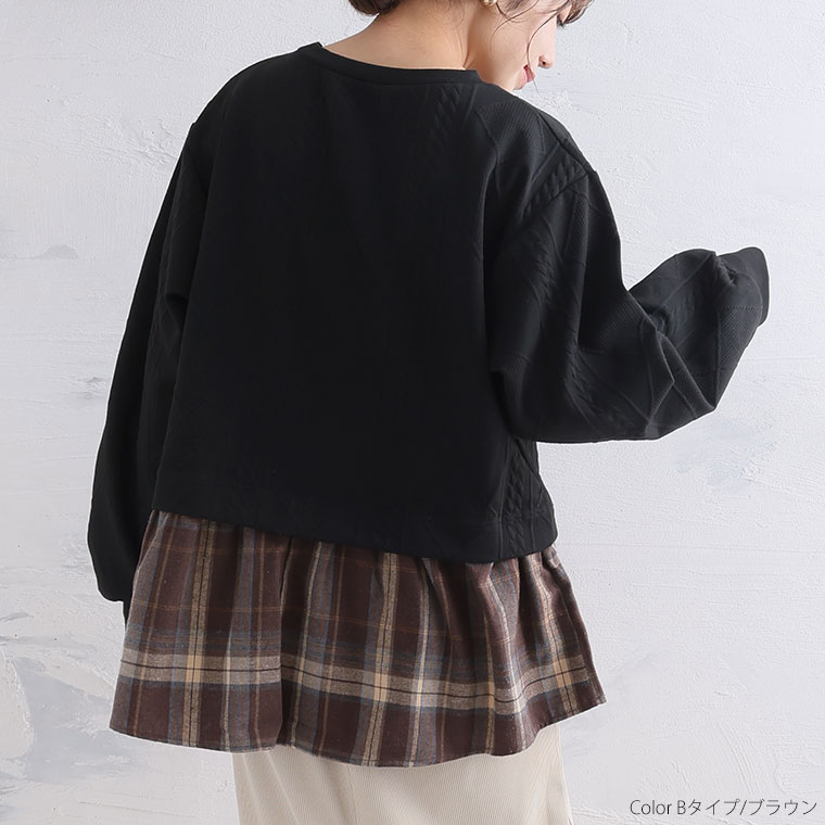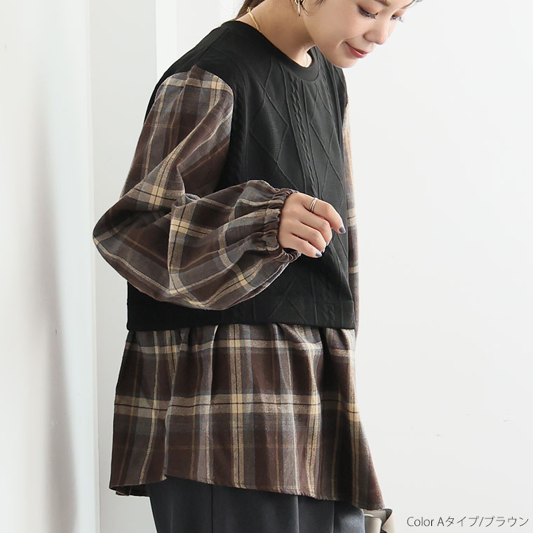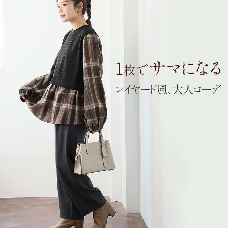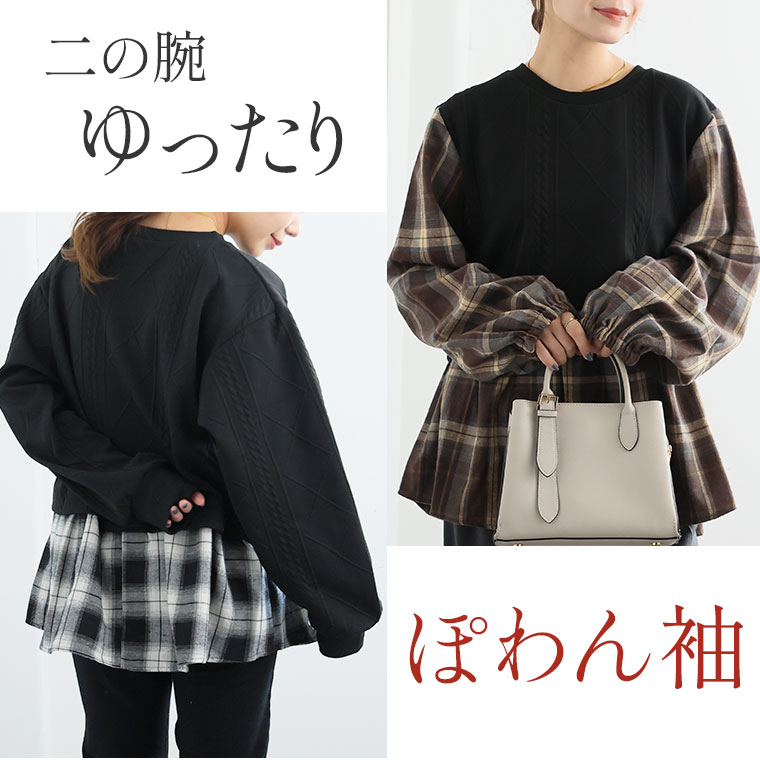 重ね着風で着ぶくれ知らず。ぽわん袖ドッキングブラウス