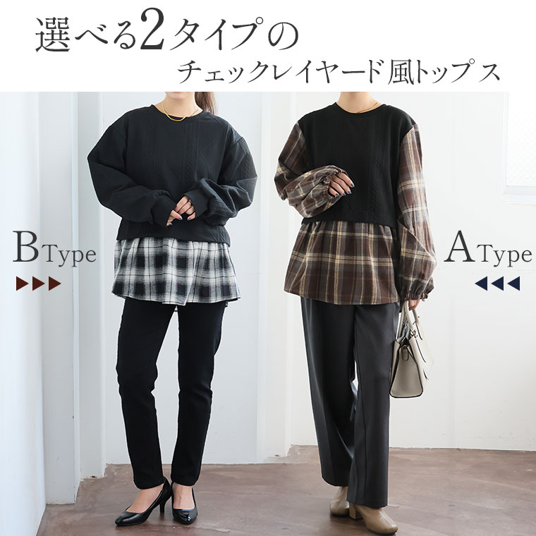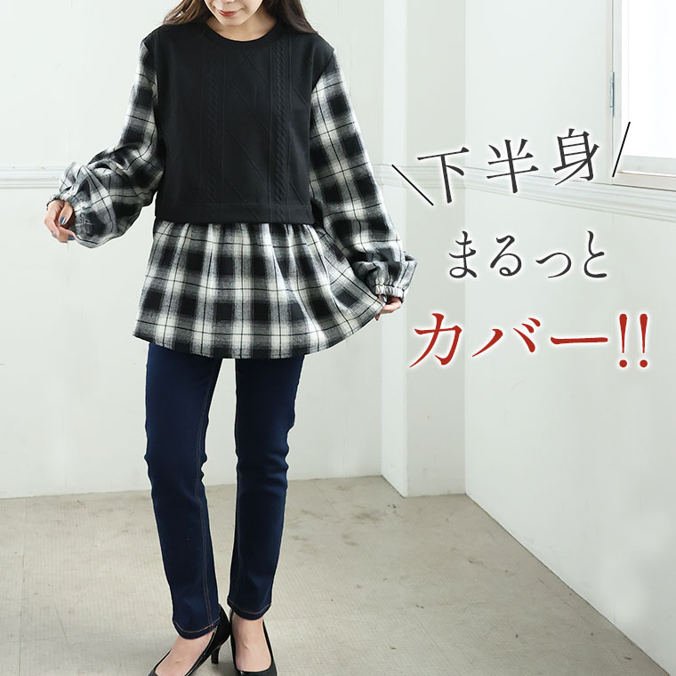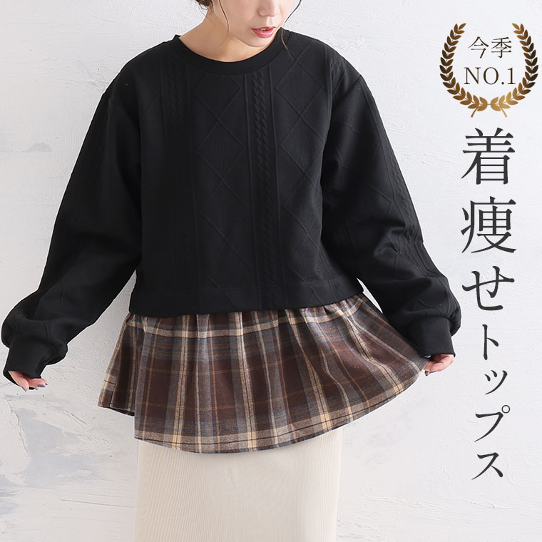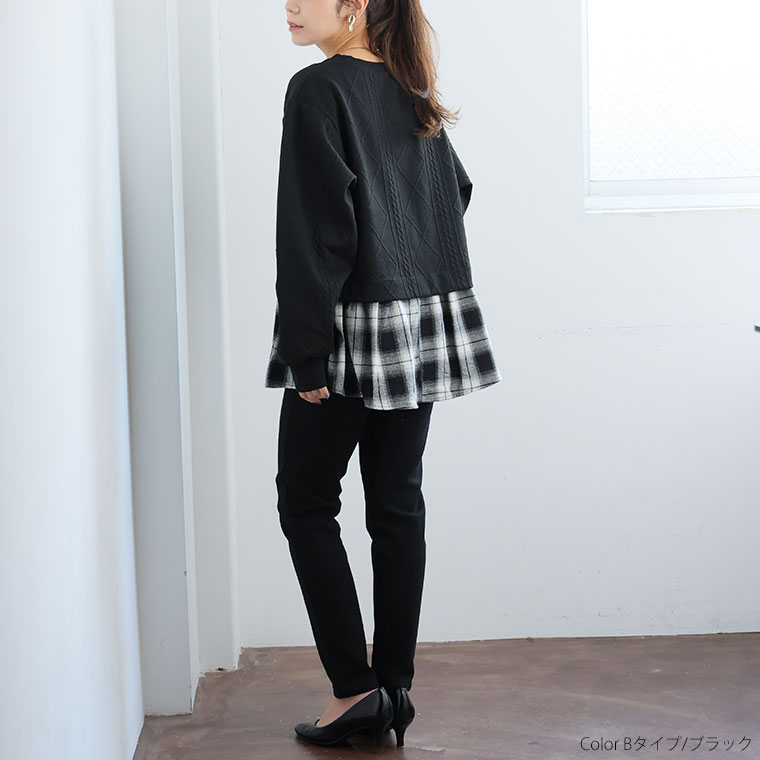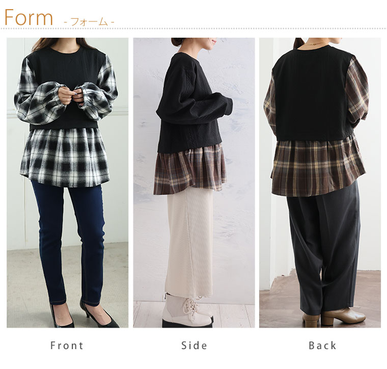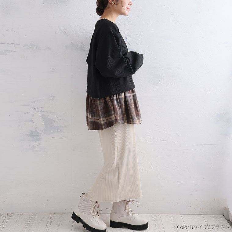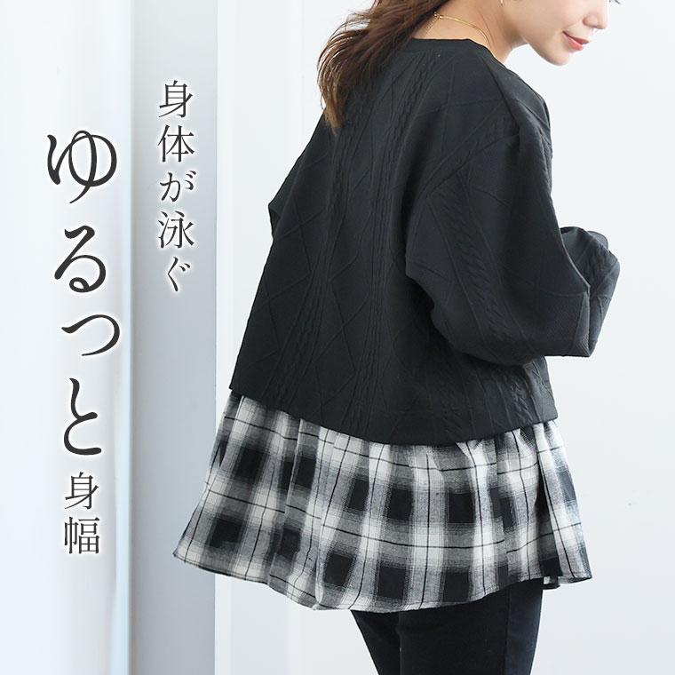 重ね着風で着ぶくれ知らず。ぽわん袖ドッキングブラウス