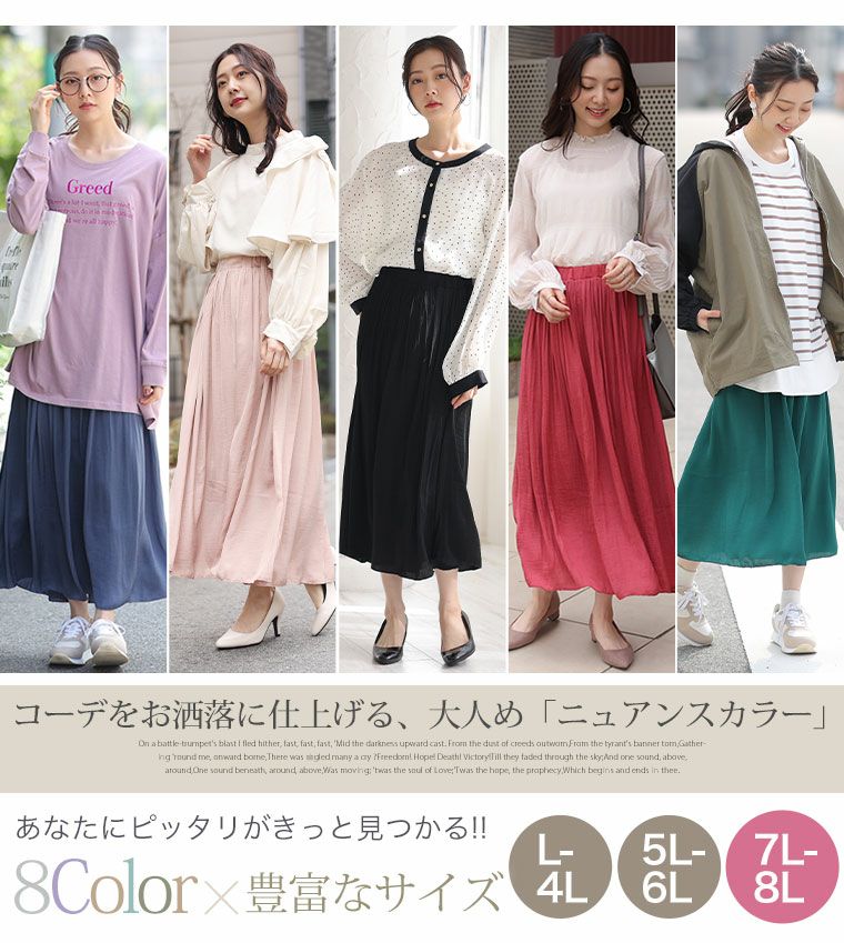 他の画像を見る ボトムス プリーツスカート LL 3L 4L 5L 6L 春 春物 春服 ぽっちゃり ゆったり かわいい おしゃれ カジュアル ナチュラル プラスサイズ 【LUMFORLE produced by My:nia】ヴィンテージサテン プリーツ ロングスカート | 大きいサイズの通販ならハッピーマリリン 価格 ¥ 4,990 税込 4.33 在庫切れ お気に入りに登録する