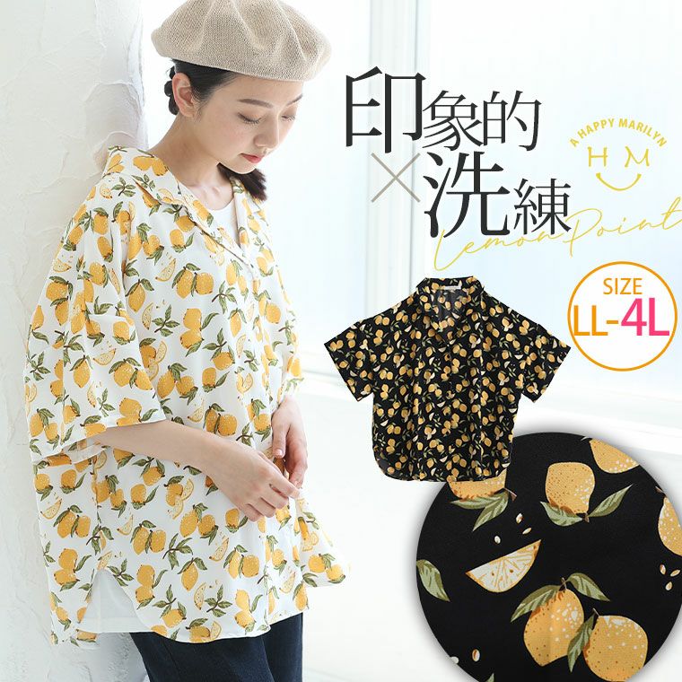 他の画像を見る ブラウス トップス LL 3L 4L 夏物 夏服 夏用 ぽっちゃり ゆったり かわいい おしゃれ カジュアル プラスサイズ きれいめ 上品 レモン柄 プリント オープンカラー シャツ | 大きいサイズの通販ならハッピーマリリン 価格 ¥ 3,190 税込 4.00 在庫切れ お気に入りに登録する